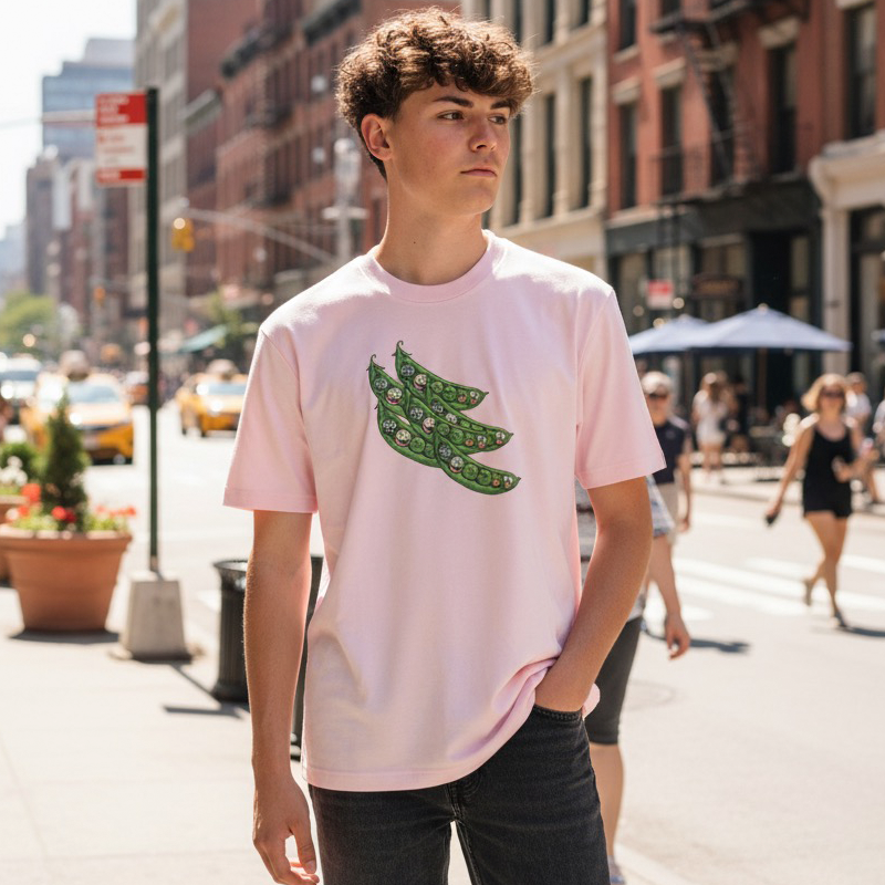 La camiseta Greenpeas muestra un original diseño de vainas de guisantes con expresiones faciales únicas, simbolizando diversidad, humor y personalidad. Una prenda que destaca por su espíritu desenfadado y su estética urbana.