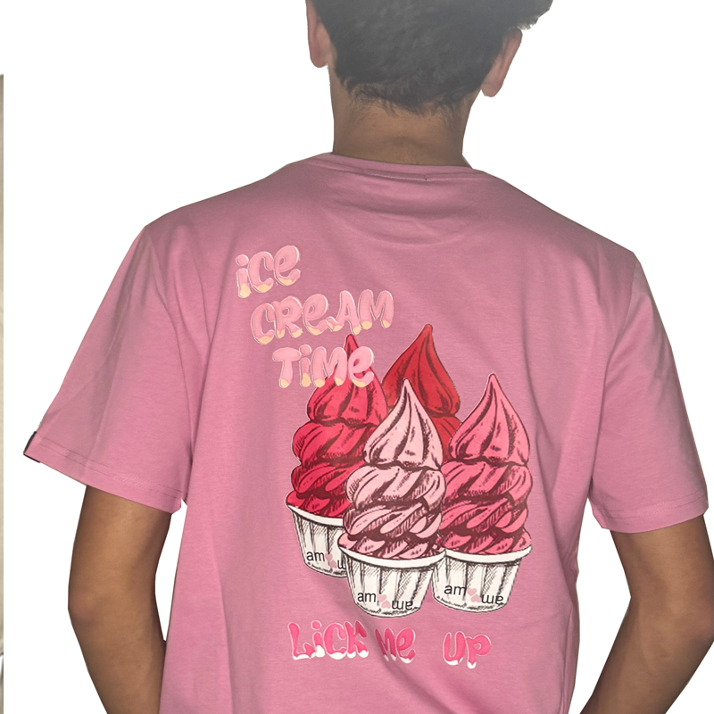 La camiseta Ice Cream Time es puro streetwear con actitud. Su diseño trasero muestra tres helados en tonos rosas y rojos junto al mensaje “Ice Cream Time – Lick Me Up”, una mezcla de humor y estilo que no pasa desapercibida.