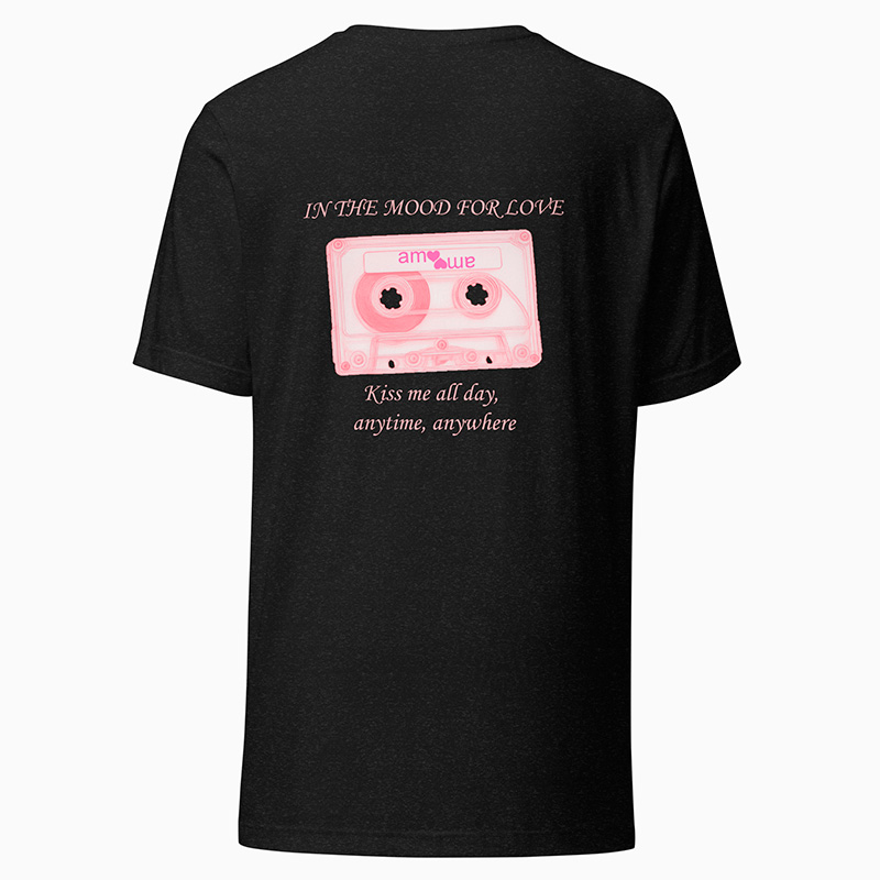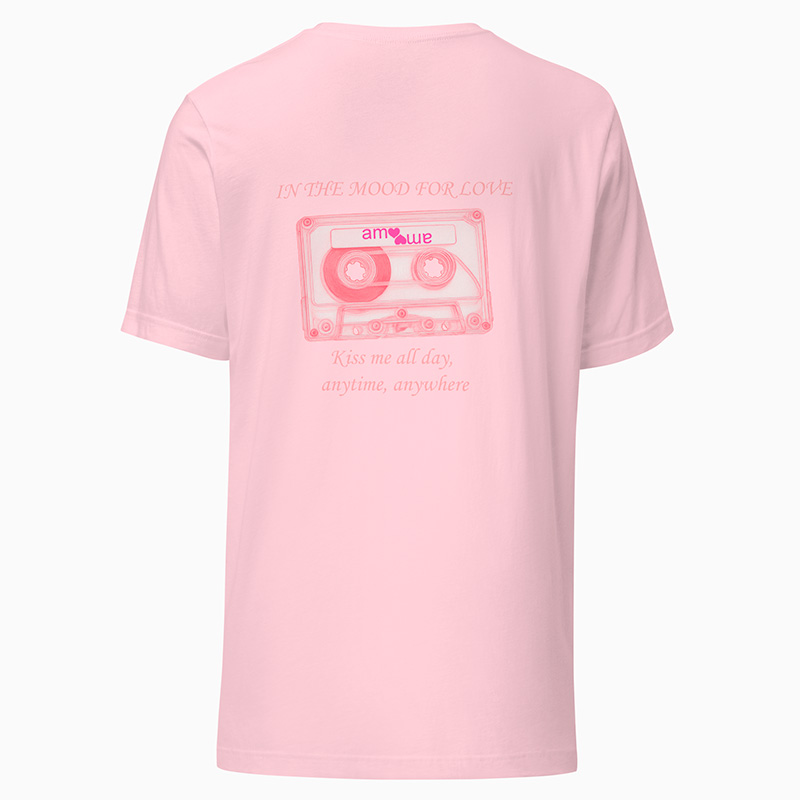 La camiseta In the Mood for Love presenta un diseño con una cinta de cassette rosa y el texto “Kiss me all day, anytime, anywhere”, un guiño al amor sin horarios y a los recuerdos de otra época.