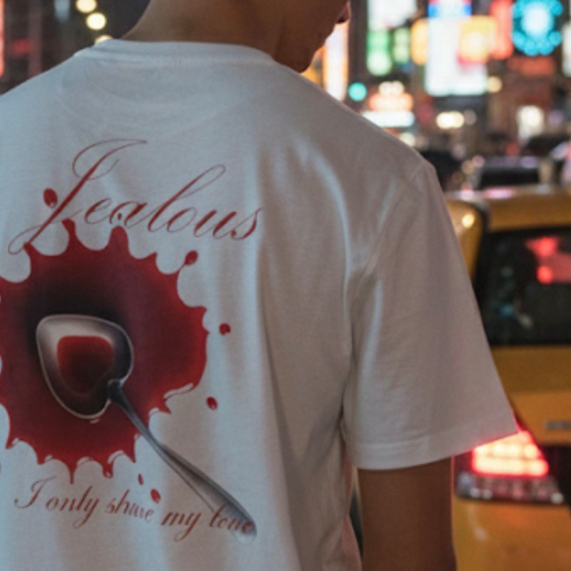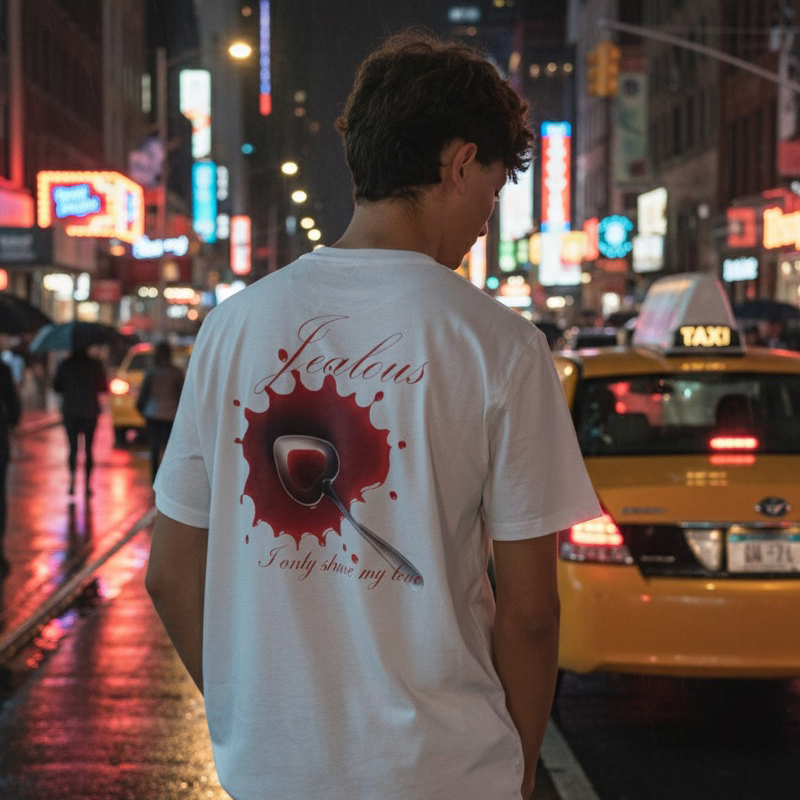 La camiseta Jealous transmite ese toque pasional y sincero con su mensaje “I only share my love”, acompañado de un diseño con un corazón atravesado en tonos rojos intensos sobre fondo rosa.
