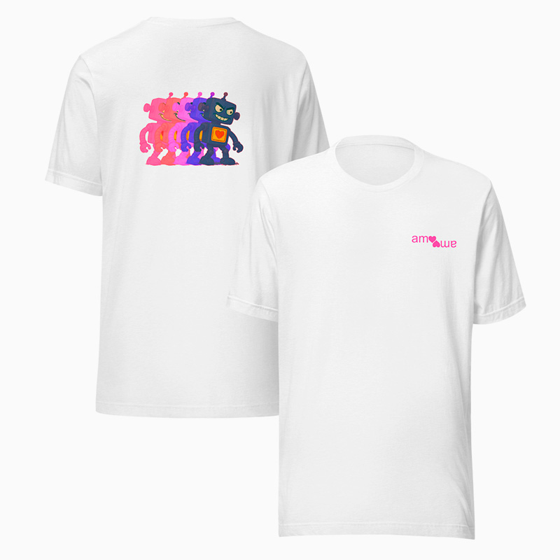 La camiseta Robot Love combina el estilo urbano con un diseño vibrante lleno de energía. En la parte trasera, un robot multicolor con corazón brillante simboliza la mezcla entre lo digital y lo humano: amor en versión futurista. En el frente, el logo amoamo en rosa destaca con un toque minimalista.