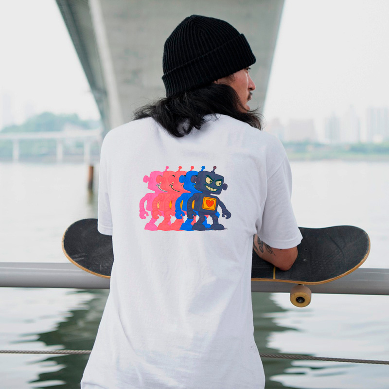 Detalles: estampado trasero del robot y logo amoamo en el pecho.