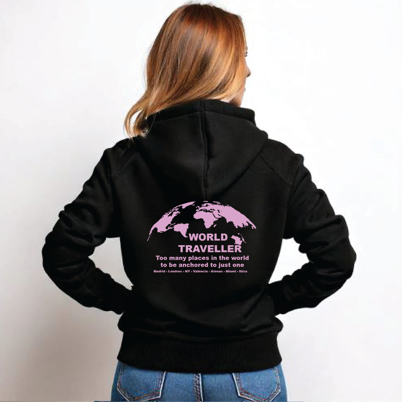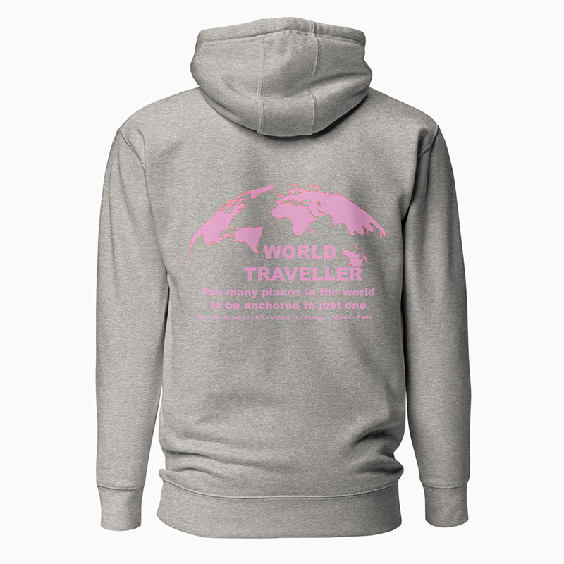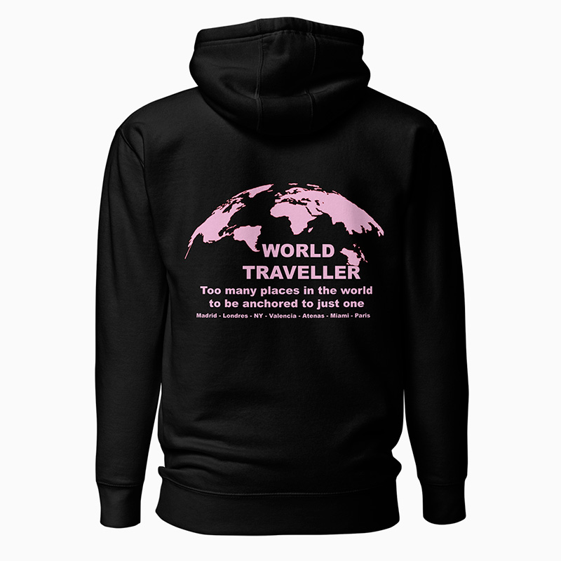 La World Traveller Hoodie está diseñada para espíritus libres y curiosos que viven con una maleta en la mente. Su diseño trasero, con un mapa del mundo en rosa pastel y la frase “Too many places in the world to be anchored to just one”, refleja una forma de vida: moverse, descubrir y no anclarse a un solo lugar.
