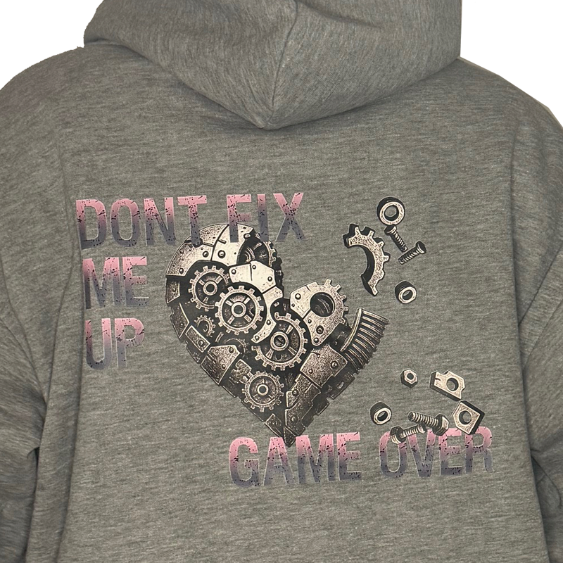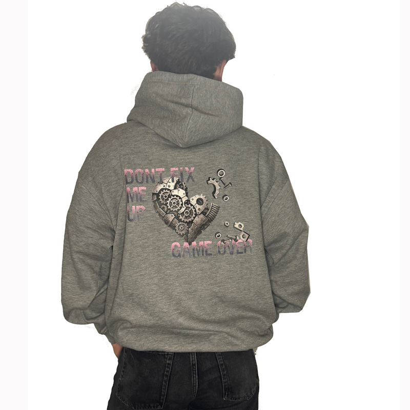 La sudadera Don’t Fix Me Up combina actitud, estilo y un mensaje potente: “DON’T FIX ME UP – GAME OVER”, acompañado de un corazón mecánico formado por engranajes. Un diseño que refleja fuerza, autenticidad y la decisión de ser uno mismo, sin filtros.