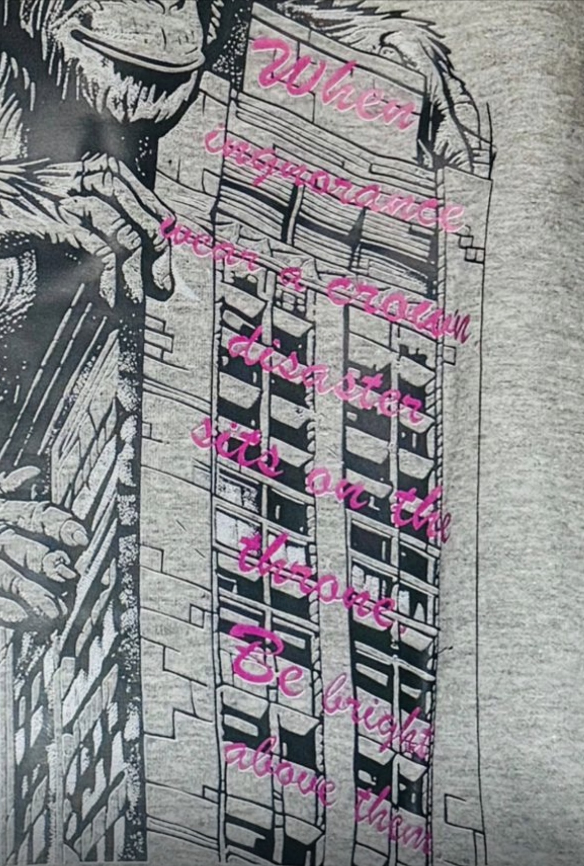 Detalle espalda: diseño impreso en la espalda monos coronado llegando a la cima y texto “when ignorance wear a crown, disaster sit on the thorne. Be bright above them.”.