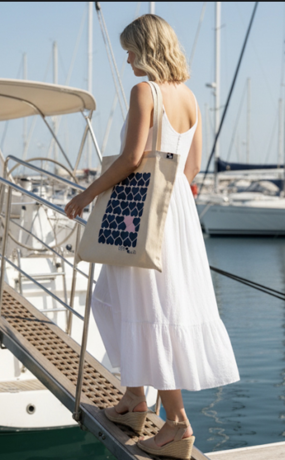 La tote bag Hearts combina estilo minimalista y mensaje sutil. Su diseño está formado por una cuadrícula de corazones azul marino con un corazón rosa que rompe la rutina, símbolo de autenticidad y diferencia —justo lo que representa amoamo.